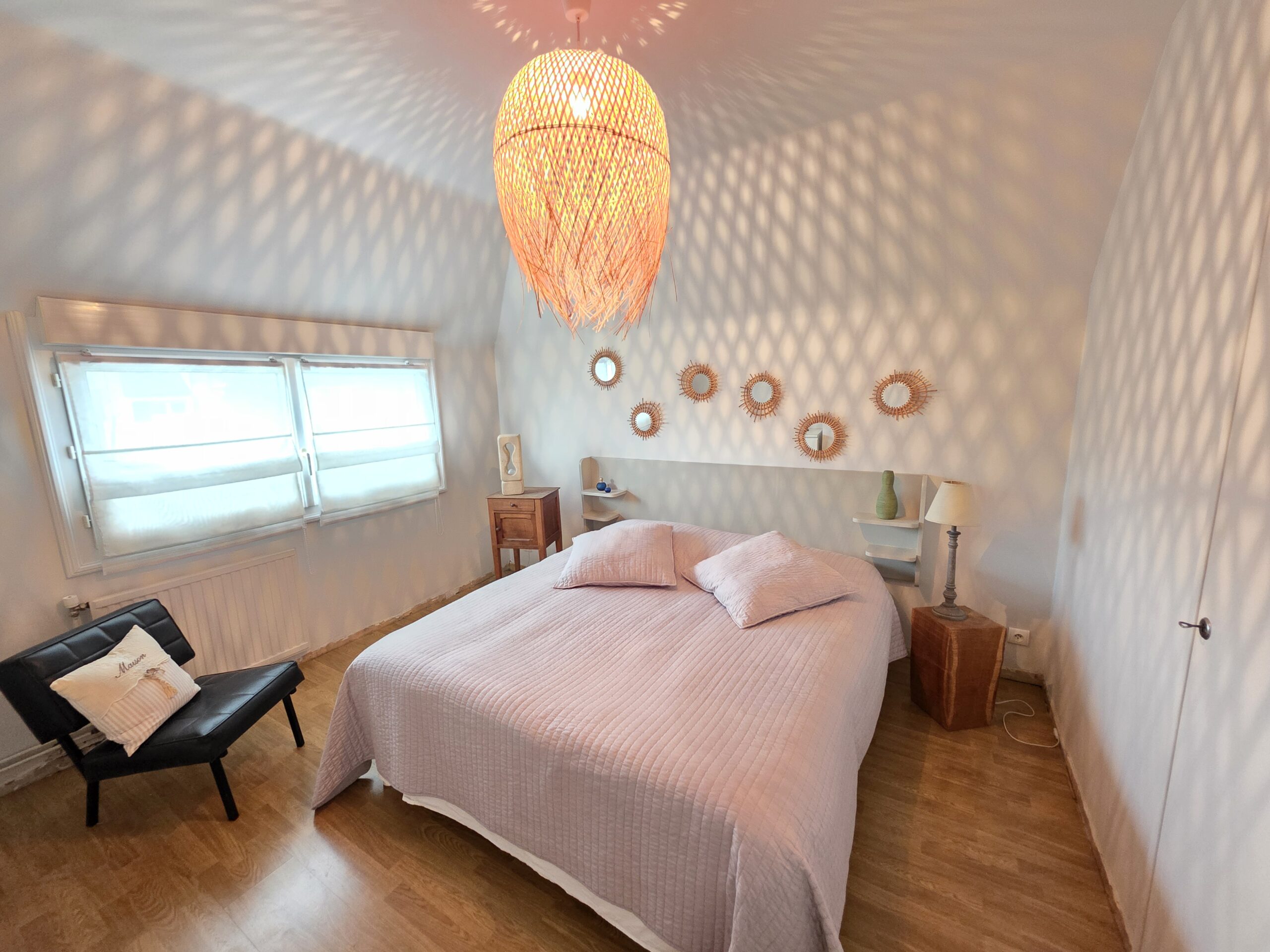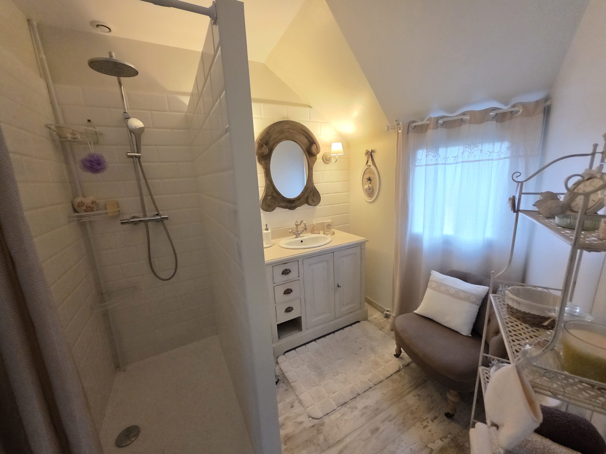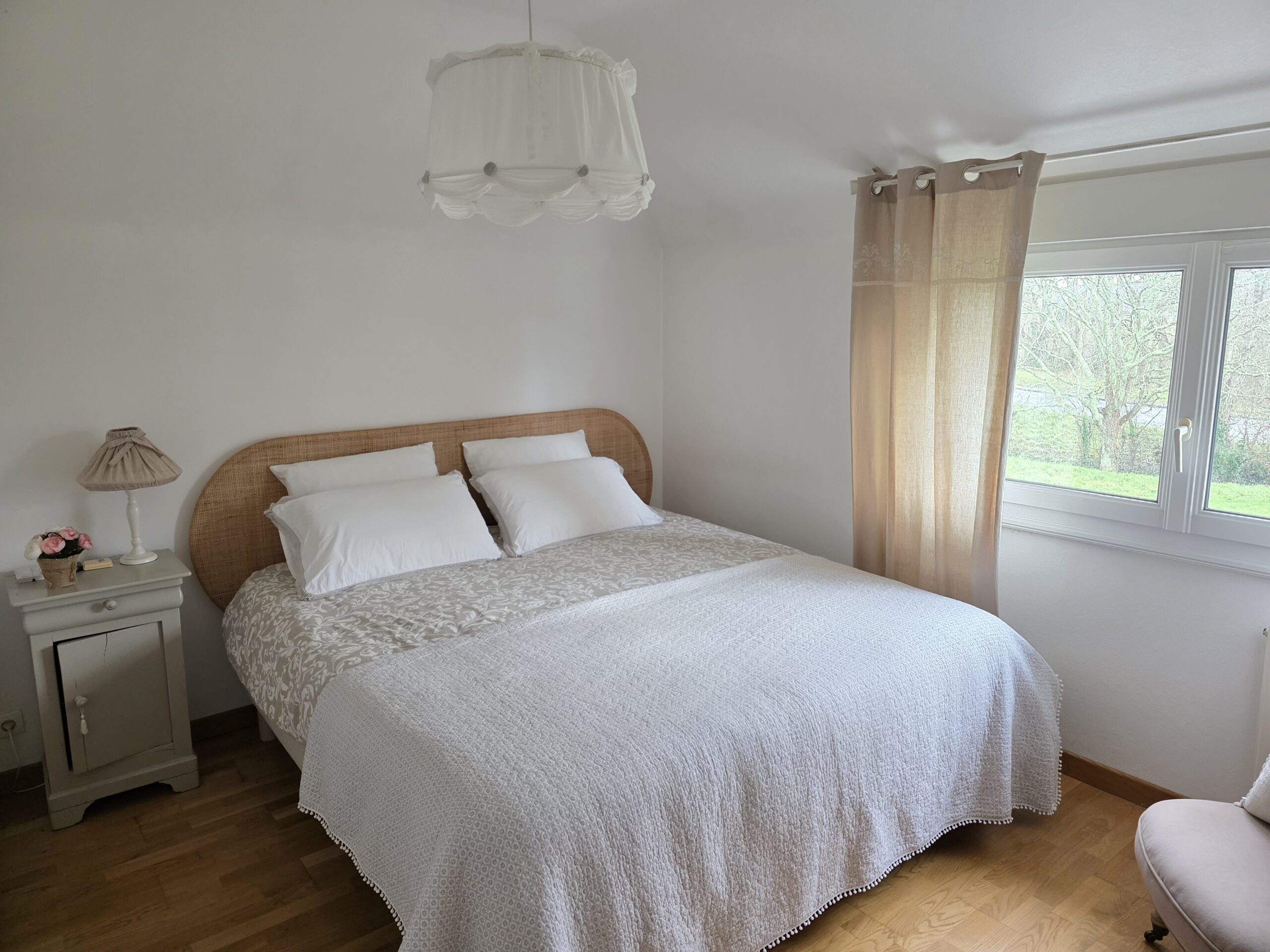 À l’étage, le palier distribue deux chambres, un bureau, une salle de bains et un second WC indépendant.