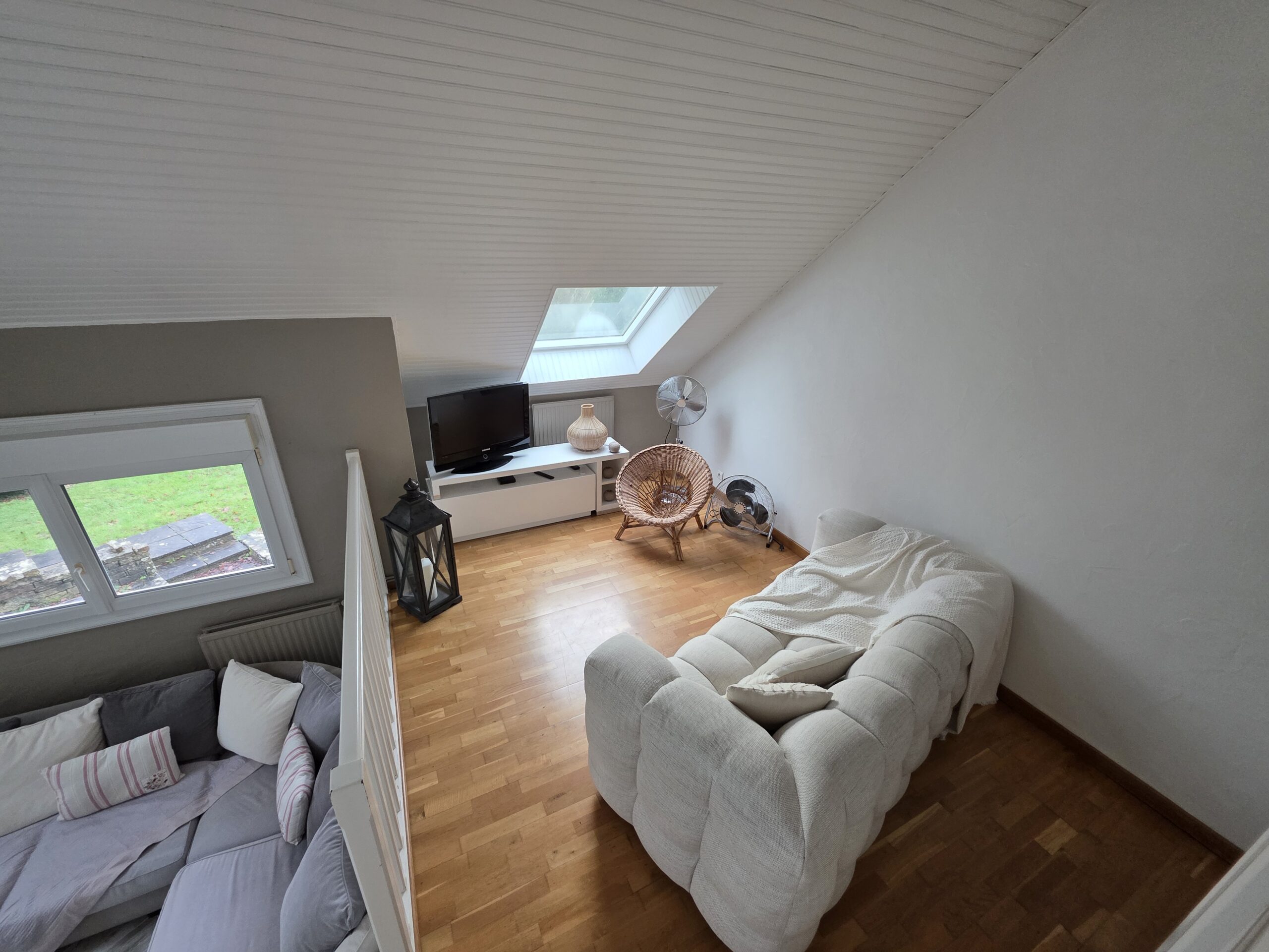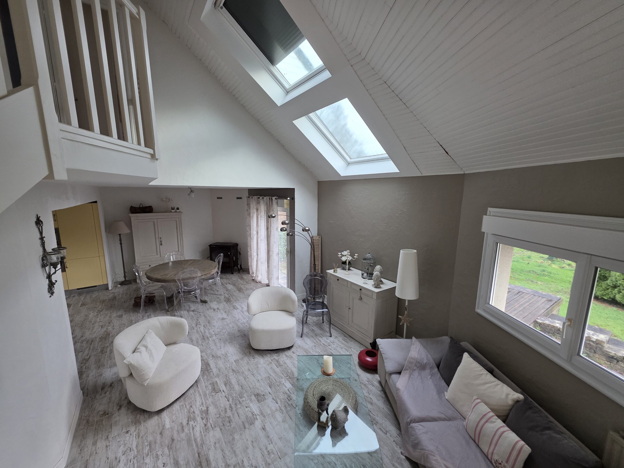 Au rez-de-chaussée, une entrée dessert une belle pièce de vie lumineuse avec cuisine ouverte, un salon chaleureux agrémenté d’un poêle à bois et d’une mezzanine offrant un espace supplémentaire (coin lecture, bureau ou salle TV). Vous y trouverez également une chambre ainsi qu’un WC séparé.