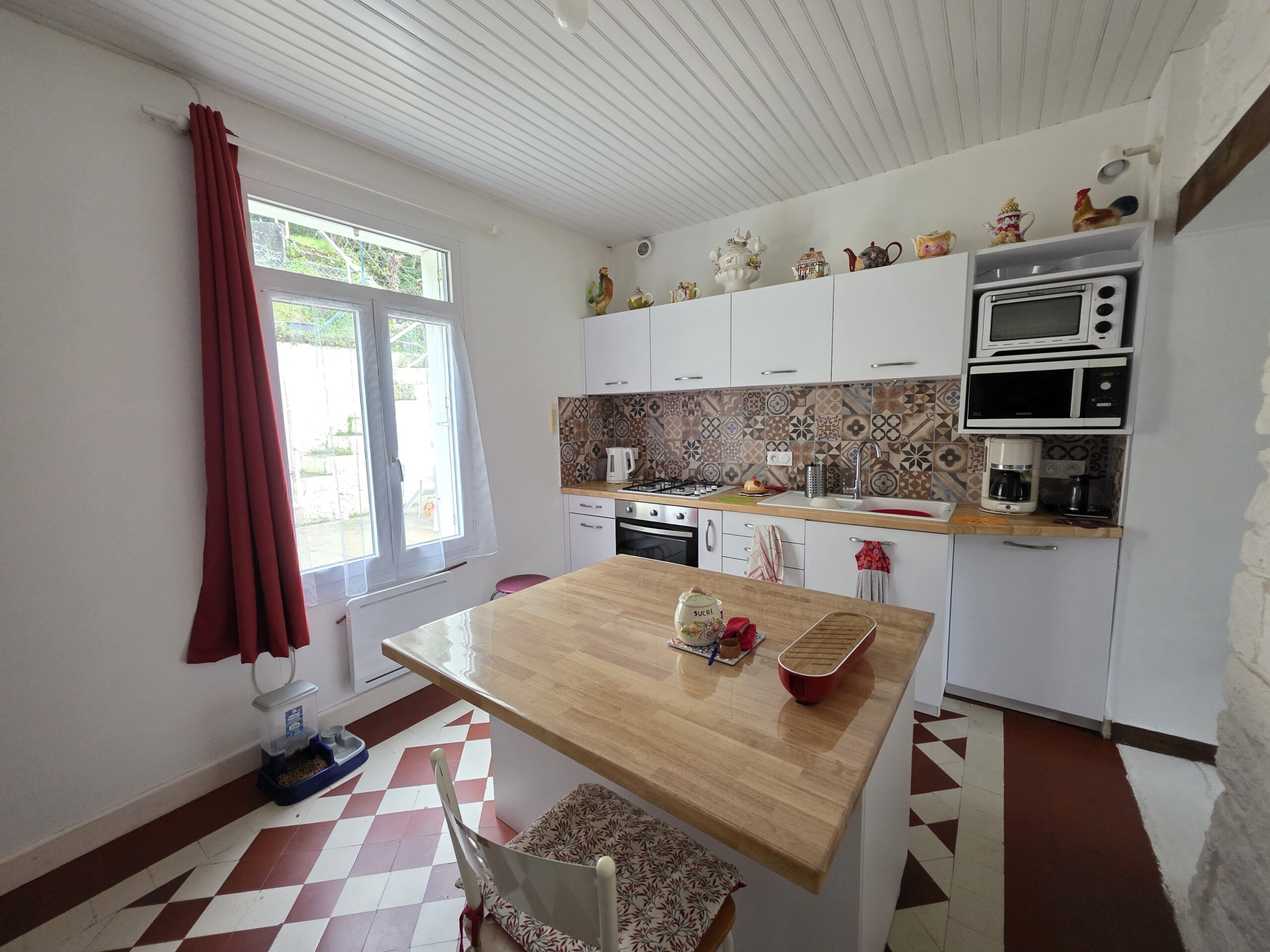 Une cuisine aménagée avec îlot central